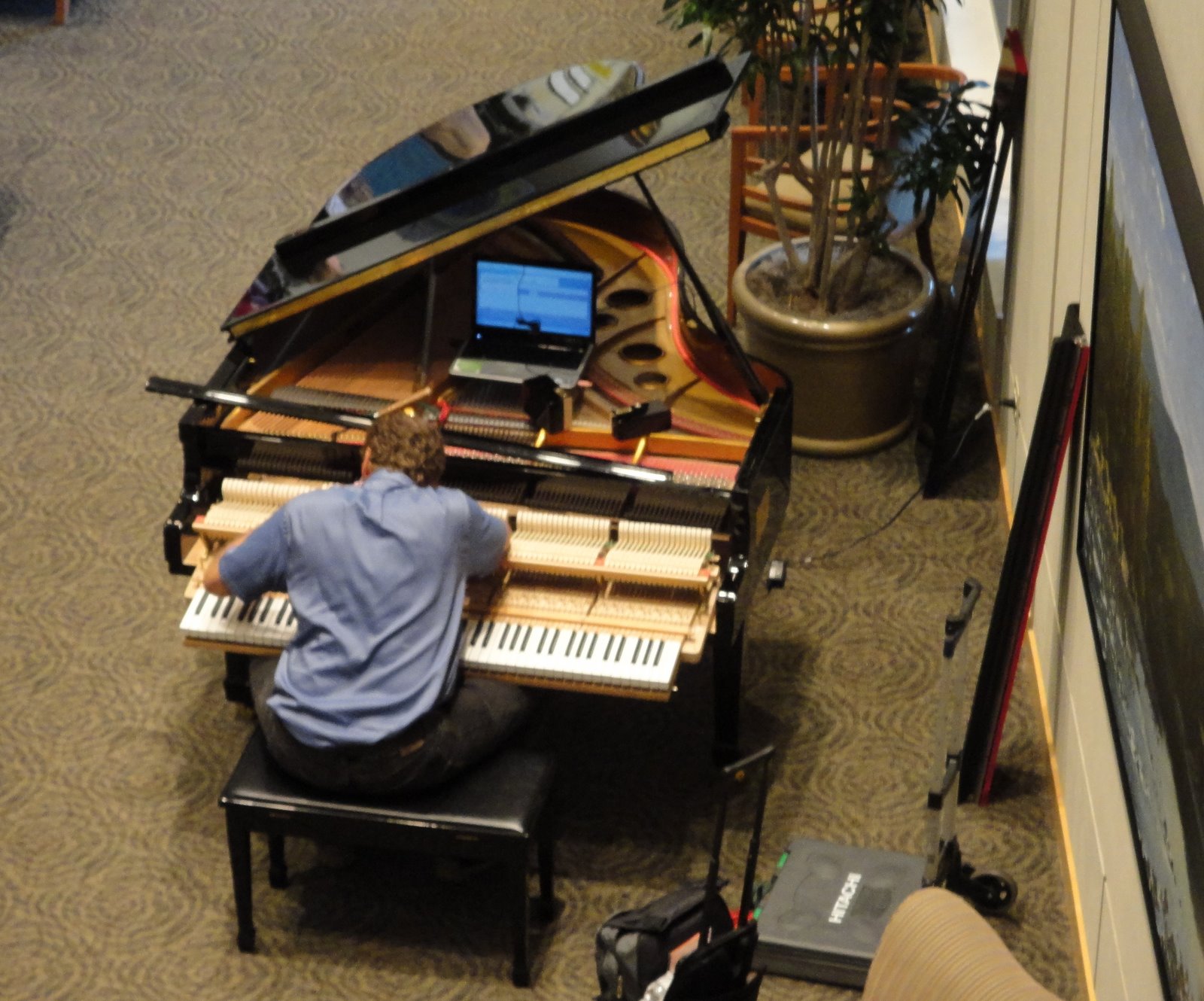 Really pretty simple, he is tuning this piano. It is a player piano located on the first floor of St. Luke's Hospital in the Woodlands, Texas (suburb of Houston). I found him during one of my many visits there for my knee and back problems.