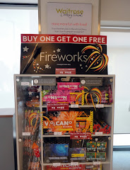 The middle picture was the candy row dedicated to Halloween and the one on the right was a fireworks for sale display shelf. I haven't heard many fireworks on Halloween night. I think they are more for Guy Fawkes Day celebrating. [http://en.wikipedia.org/wiki/Guy_Fawkes_Night]