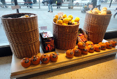 Pumpkin Things in a Row I found at the Waitrose Supermarket, Finchley Road, London. Mrs. Jim bought one of the small pumpkins for £.99 to make the jack-o-lantern in the picture below. We have been using it as a center piece on the dining table now for a week.