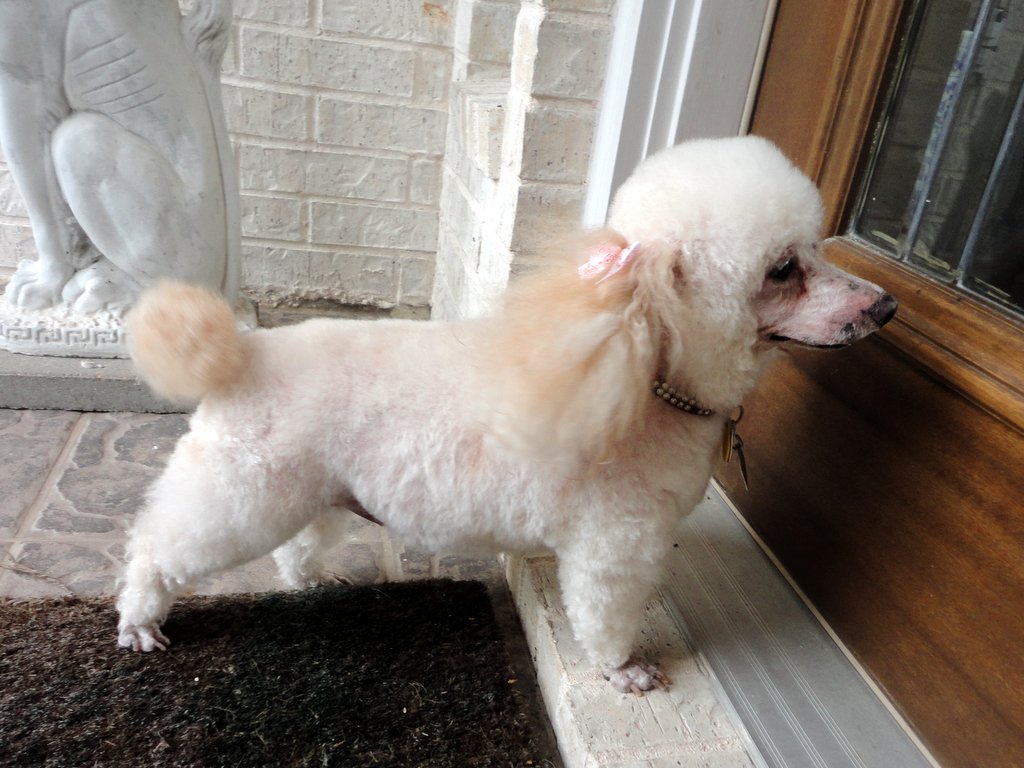 The White truck above makes grocery store deliveries on Karen and Billy's street. The delivery charges are very reasonable. And then our White dog, Katrin, has had a shampoo, nail job, and a haircut at the groomers. Can you see the Halloween decorations on the ear ribbons? She has been "outside" and now is wanting in.